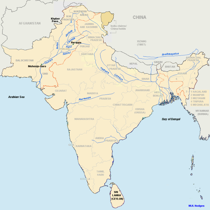 In the Indus river valley (in today’s Pakistan) archeologists have discovered the remains of a number (actually a quite large number) of cities and towns of very ancient existence - dating back to 3000 or even earlier. Two of these cities are quite extensive: Harappa and Mohenjo-Daro. We know very little about them except that they developed very orderly urban communities and they seemed to be a fairly non-military society. Oddly, archeologists have failed to uncover anything that might have served as a temple – bringing forth another question about these people. Surely they had a priesthood of some kind – or some kind of moral leaders whose work was to keep earthly society aligned correctly with the world of the divine. The very orderliness of the Indus River communities indicates extensive social order. In fact, it seems even to indicate that the profound order of these settlements constituted something of a kind of rigidity – which may have contributed to the decline and collapse of this society around 1700 - 1500 BC. But this would only be daring conjecture. Actually very little is know about this high civilization. It left a huge record of very orderly urban design, advanced construction techniques ... and little else. No writings or records of its inhabitants and their lives have been found. The splendid remains of this once magnificent civilization simply lie there silently, revealing nothing at all about the life that was actually lived there. Speculation is that the society may have tended to be chthonic in its religion - that is, focused more on the powers of the gods of the underworld rather than the gods of the skies, drawing mostly from the stereotypical religious pattern associated with settled agrarian rather than nomadic herding societies. But this speculation too is far, far, from certain. In short, we know nothing about them. Long has it been the natural assumption of archeologists that light skinned Aryans in invading the North of India in the middle of the second millennium BC supposedly pushed the original inhabitants into the southern delta region, where dark-skinned Dravidian are found today. It was thus assumed that the Dravidians must have been the original members of the Harappan culture. But there has so far been very little evidence connecting the ancient Harappa culture with modern Dravidian culture. Again ... we really know very little about this once great Indus River civilization. |