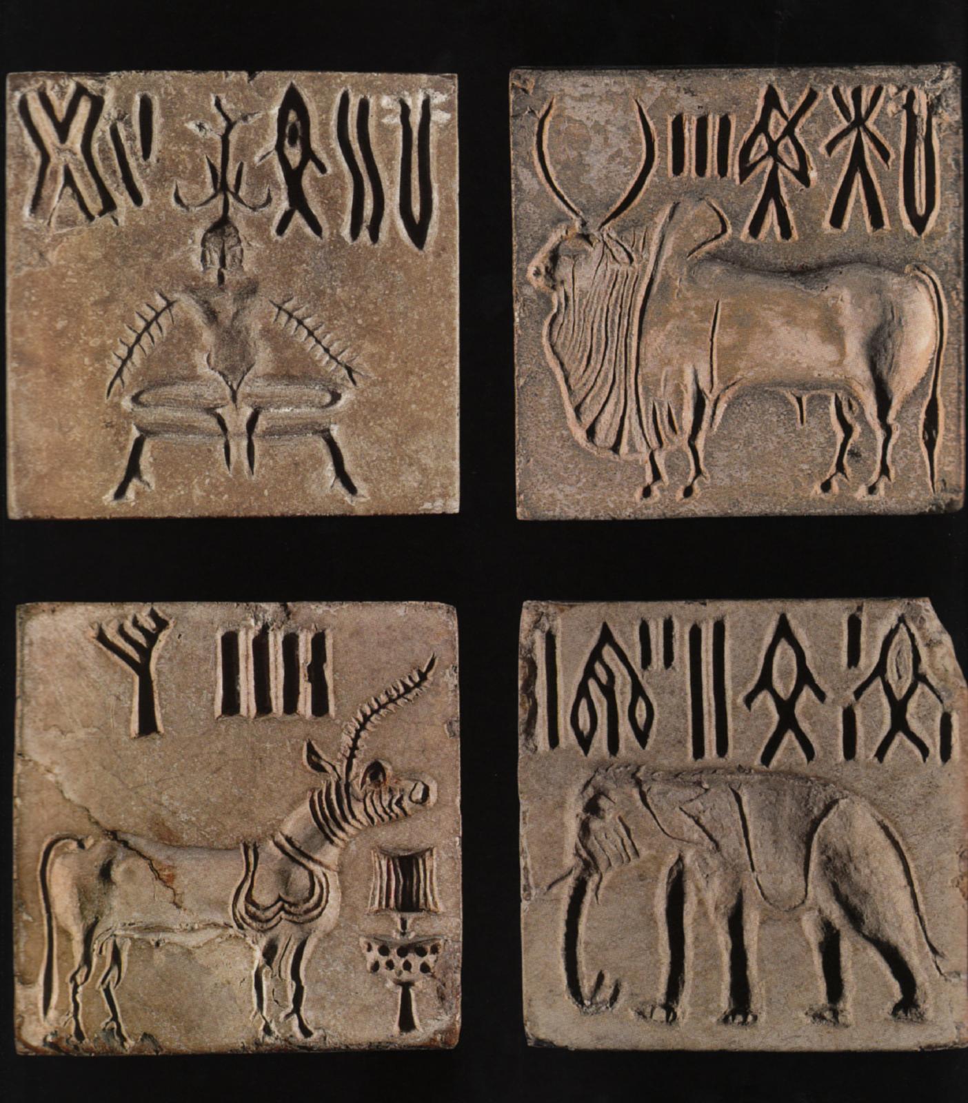 Animals, people in meditative poses, and early forms of writing (? ) adorn tiles made by the Harappans of 2000 BC