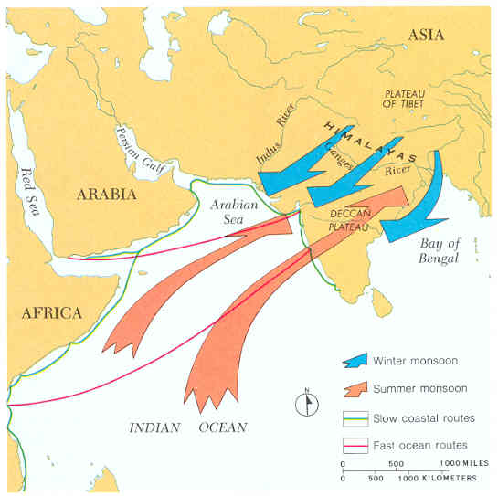 | Monsoons run from June to September, wet air currents drawn from the Indian Ocean by the extremely hot high-pressure areas over India, built up since March. When this air meets the cool along along the Mimalayan mountains, it drops its moisture, with the heaviest downpour being in India's northeast. The monsoon give India 90% of her annual rainfall. Then from October through January the winds reverse direction, bringing cool, dry breezes from the north. This movement of air reaches even out over the India ocean, making for prevailing winds which move sailing vessels quickly across the Ocean from East Africa, making for a much more rapid crossing than the slow coastal route. |